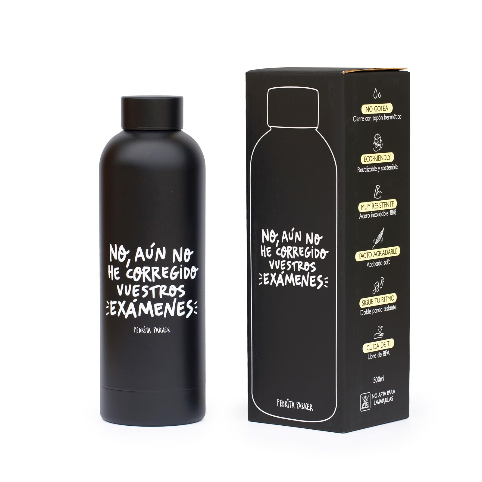 - DISEÑO DIVERTIDO: Botella térmica en color negro y acabado mate con capacidad de 500ml y con la frase “No, aún no he corregido vuestros exámenes” impresa en blanco.