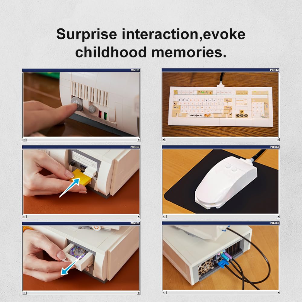- 【Set de Bloques con Detalles de Hardware Realistas】 Este detallado set para adultos está diseñado como un ordenador de escritorio. Construye un teclado y un ratón con cables, un ventilador de refrigeración, una interfaz VGA para la pantalla, tornillos, botones y una unidad de CD y disquete extraíble. Este kit es una réplica fiel de un ordenador clásico. Todas las piezas metálicas están pintadas con pintura metálica de alta calidad y todos los patrones están impresos, ¡sin necesidad de pegatinas!