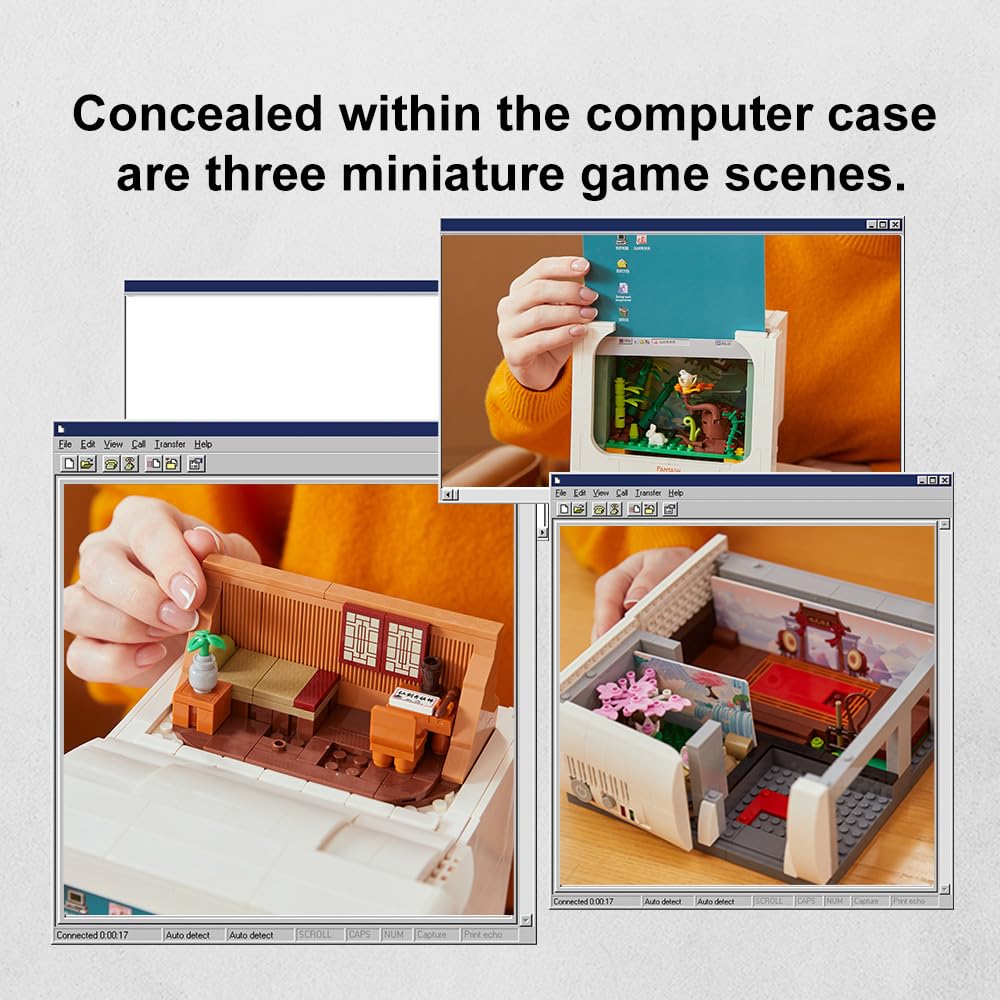 - 【6 Escenas Creativas para Exhibir】 Este set Ideas te ofrece seis fascinantes mini-escenas con tarjetas y bloques. Entre ellas, una tarjeta para el escritorio del ordenador, una interfaz de juego, un pequeño jardín dentro de la pantalla, un acogedor dormitorio detrás del monitor, un jardín oculto dentro de la carcasa y una arena. Este ordenador retro no solo es una obra maestra técnica, sino también una decoración única para tu colección.