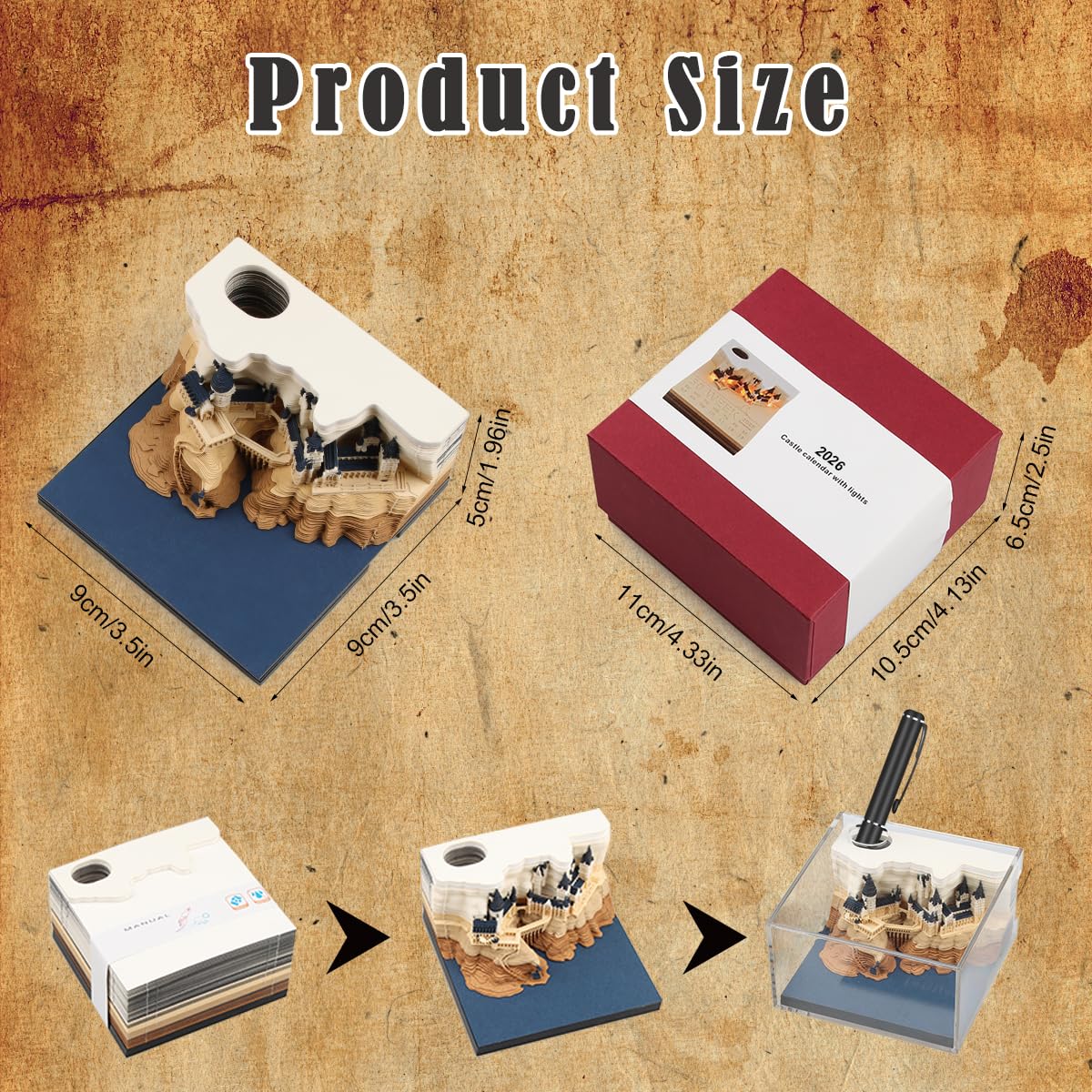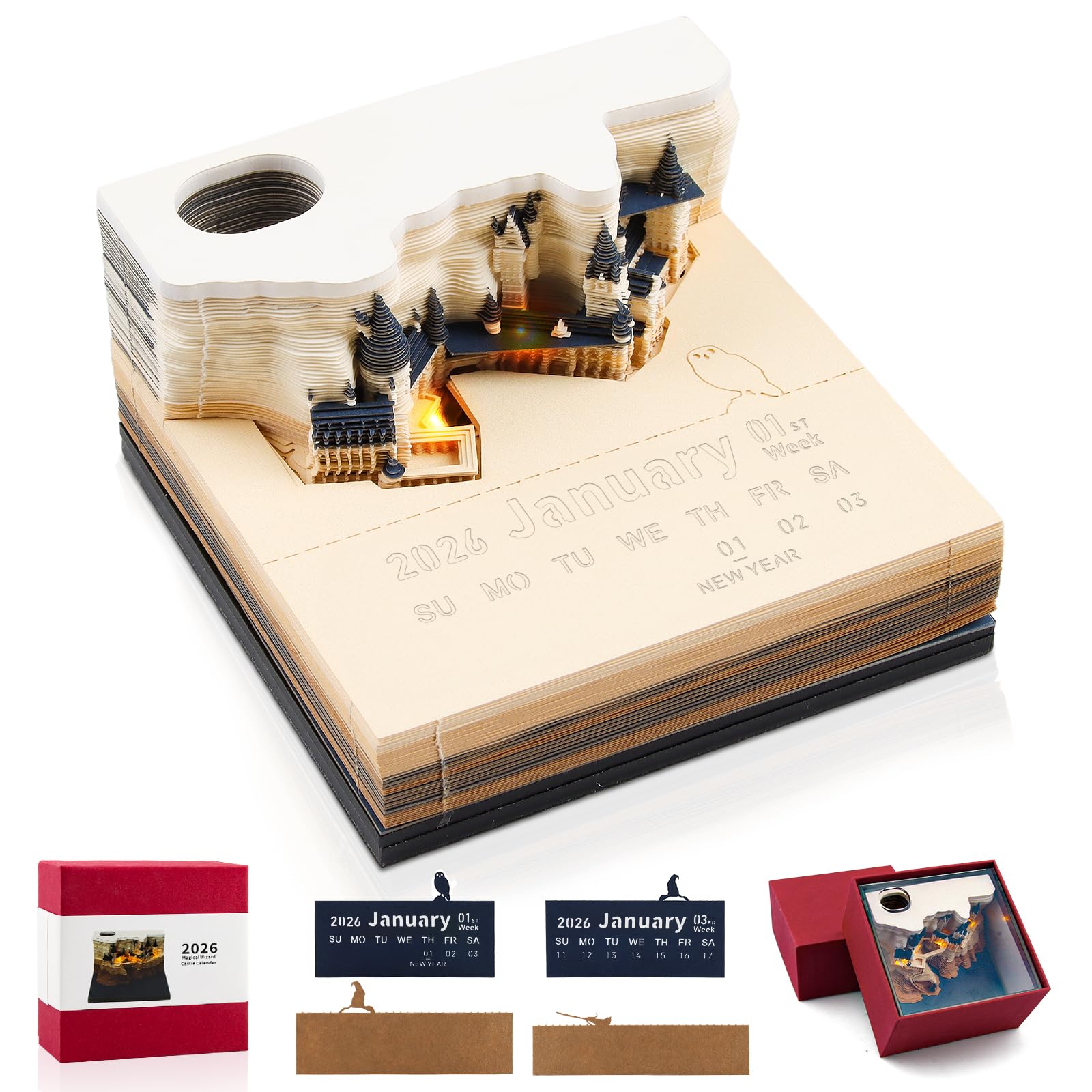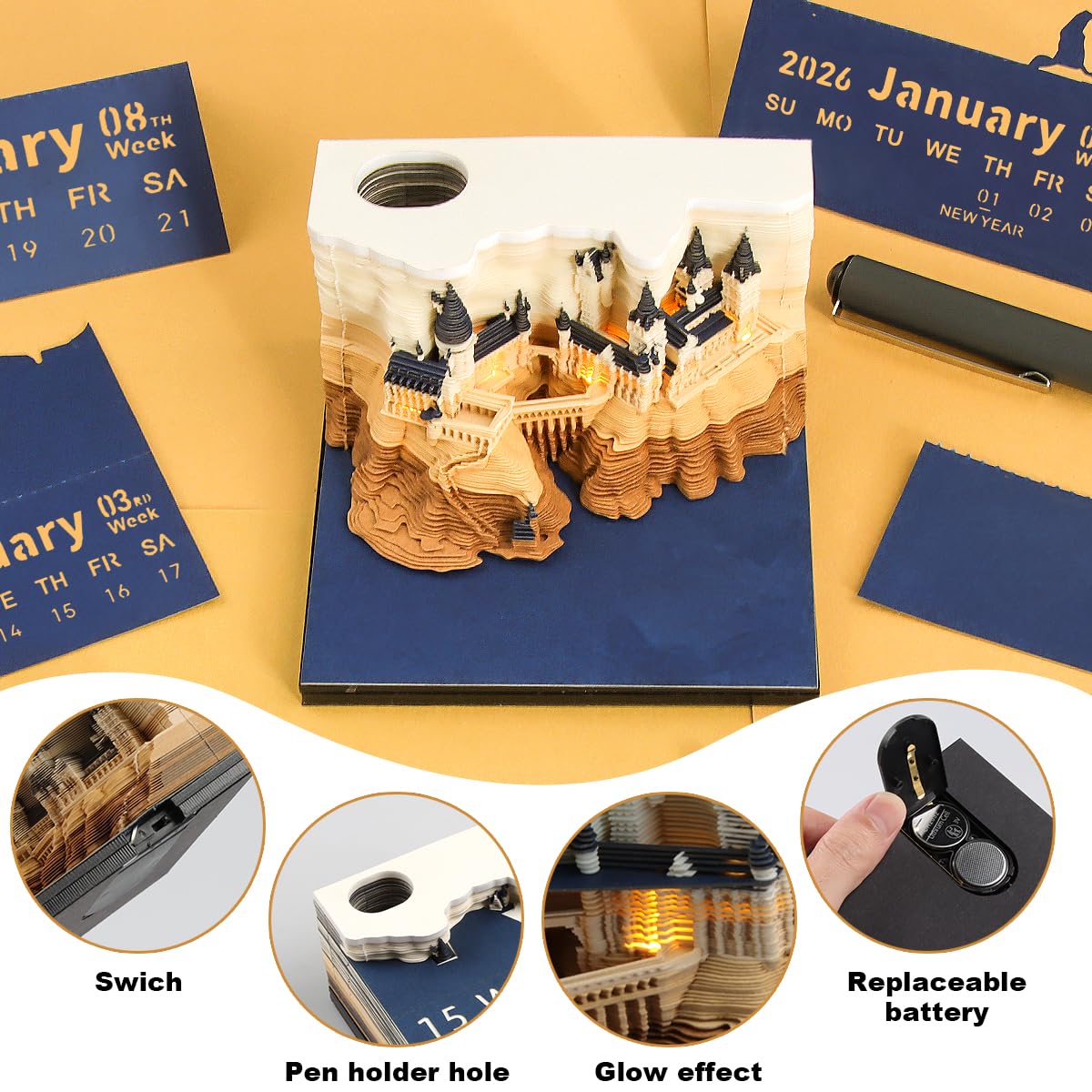 ¿Un calendario o una obra de arte? Este bloc de notas 3D esconde un secreto. A medida que arrancas las hojas de cada día o semana, vas "tallando" y descubriendo un espectacular castillo de fantasía iluminado. Una experiencia de un año que termina revelando una escultura de papel increíble para tu escritorio.