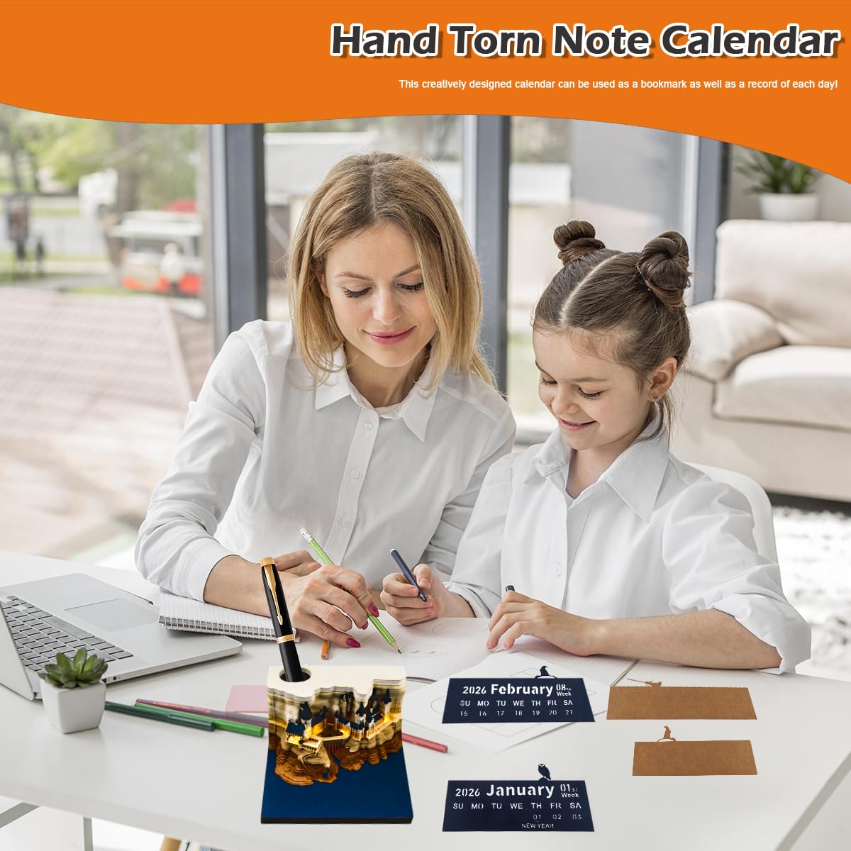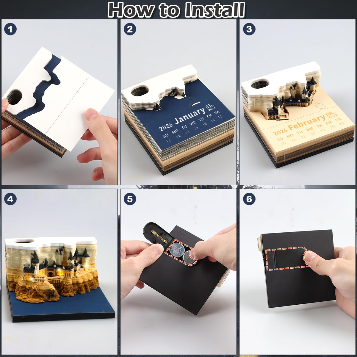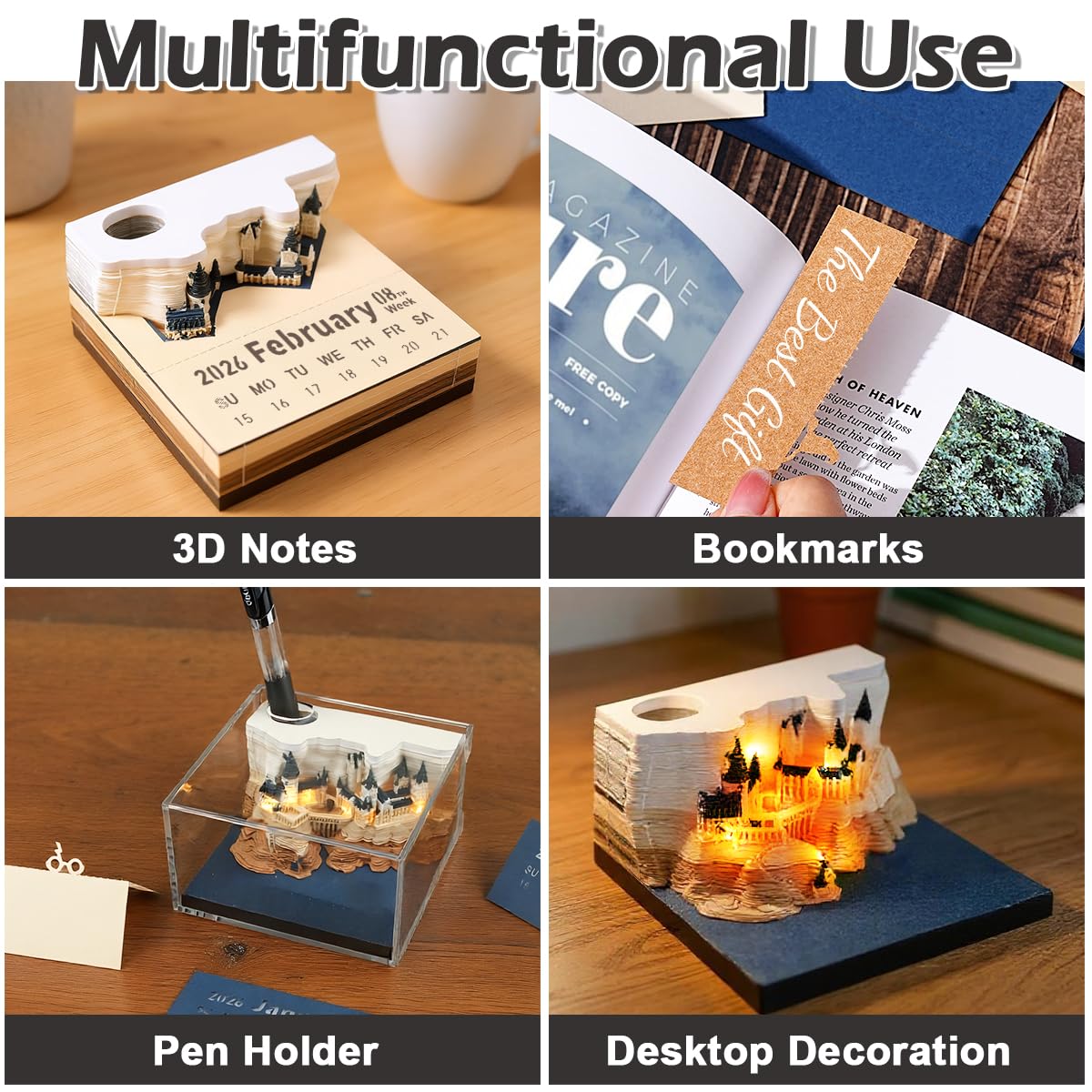 ¿Un calendario o una obra de arte? Este bloc de notas 3D esconde un secreto. A medida que arrancas las hojas de cada día o semana, vas "tallando" y descubriendo un espectacular castillo de fantasía iluminado. Una experiencia de un año que termina revelando una escultura de papel increíble para tu escritorio.