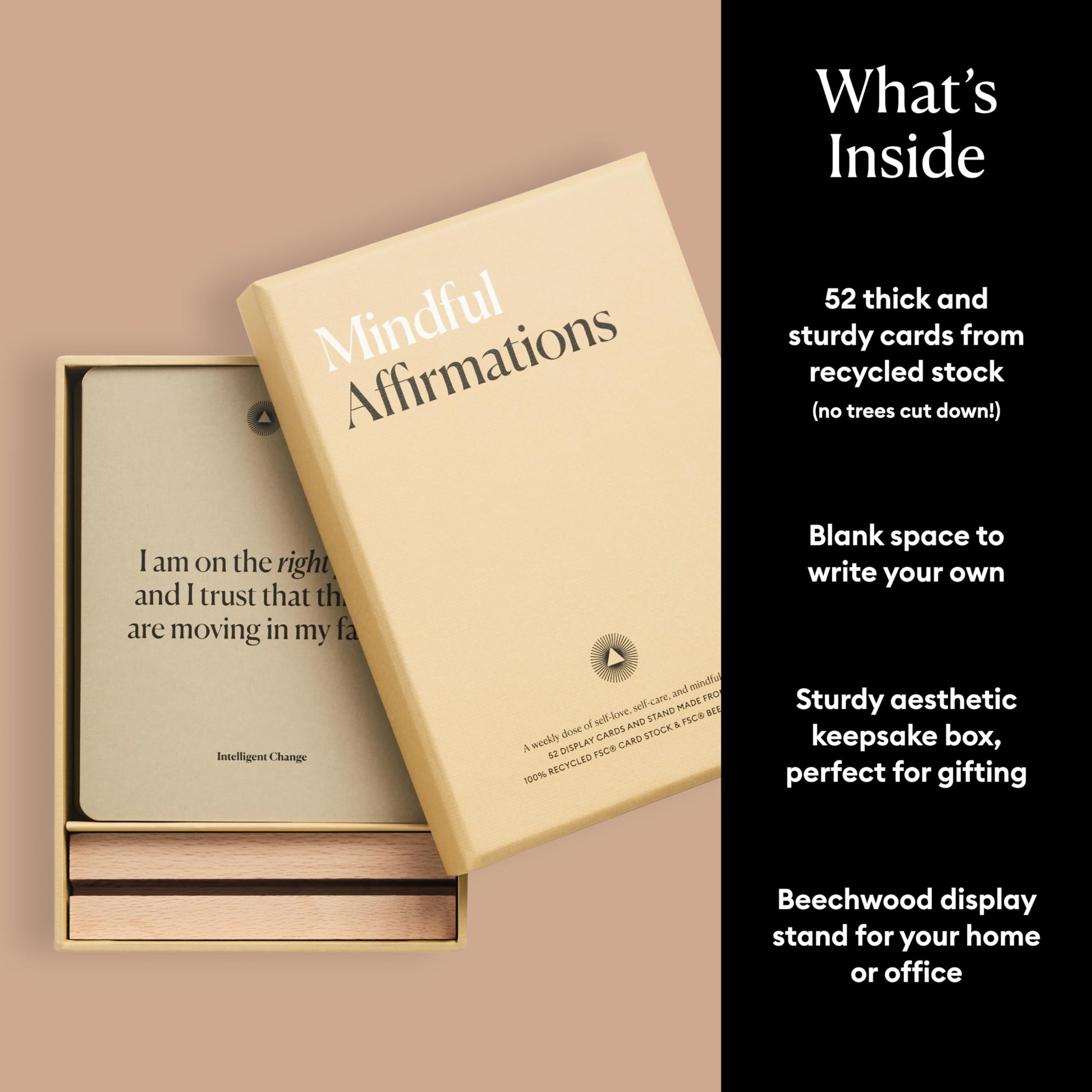 Las cartas de afirmación de Intelligent Change son pequeñas dosis de energía positiva para cada día o semana del año. Cada una contiene un mensaje inspirador diseñado para nutrir la mente, fortalecer la autoestima y fomentar una actitud de gratitud y confianza. Con su soporte de madera de haya y su diseño sostenible, son tanto una herramienta de bienestar como un objeto bello para tu espacio.