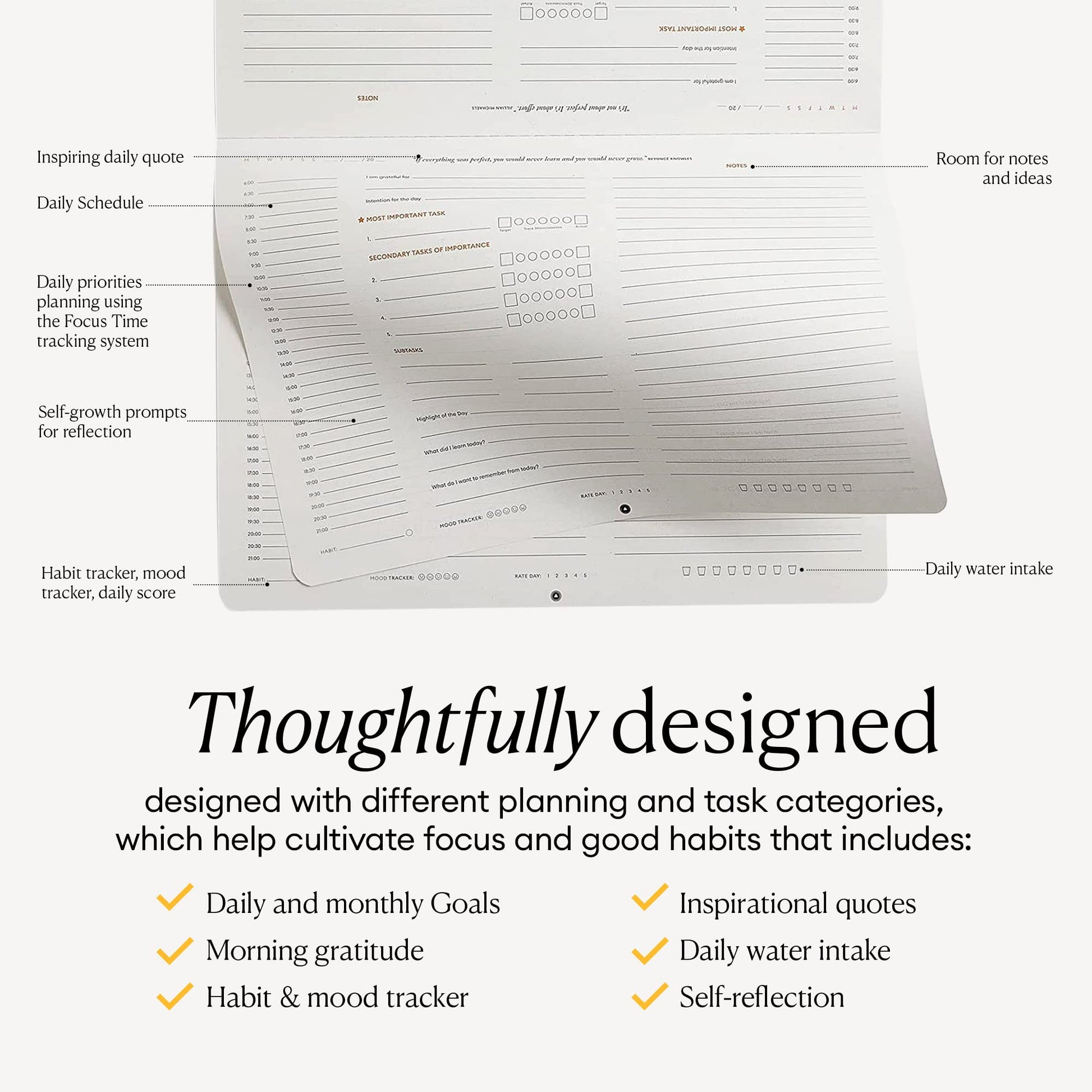 • Planificador diario sin fecha: organiza tus días a tu ritmo, con secciones para tareas, horarios y objetivos.