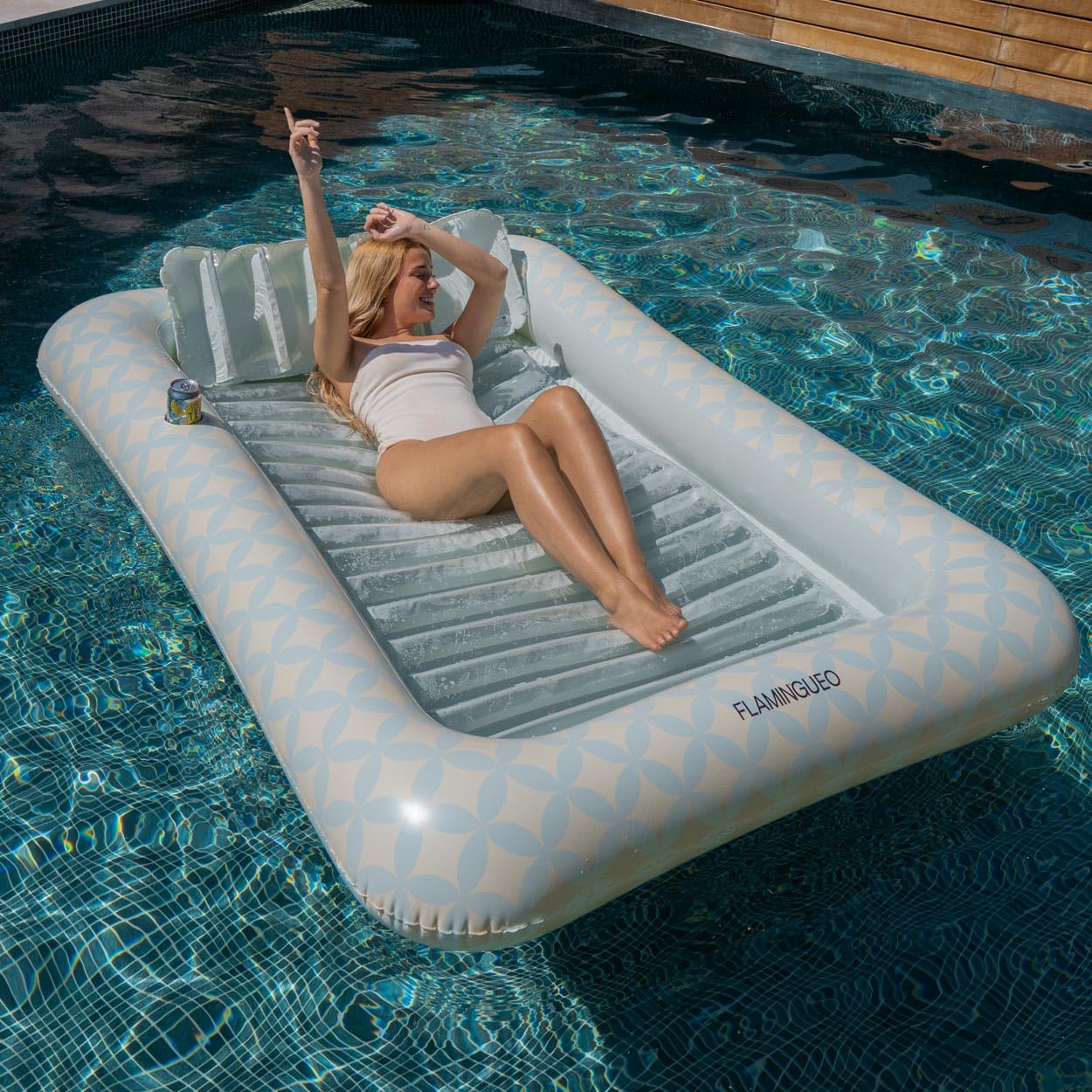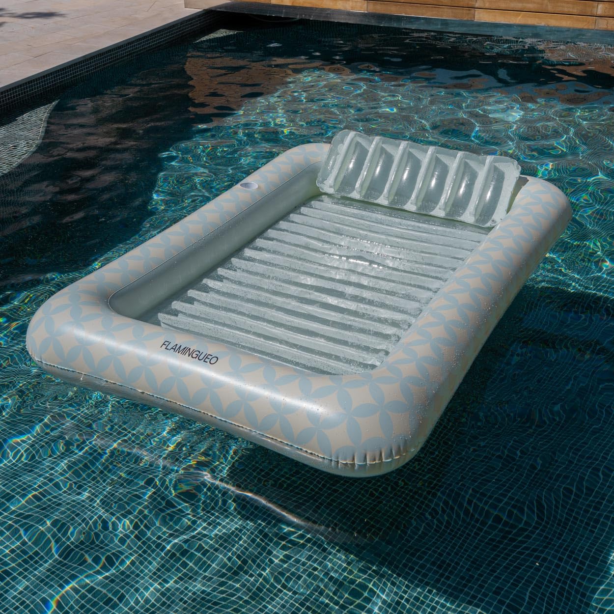 Reina en la piscina con estilo. Este flotador gigante de Flamingueo (más de 2 metros) no es una colchoneta cualquiera; es una isla privada de relax. Con un diseño geométrico vibrante y espacio de sobra para tumbarte a tus anchas, serás la envidia de cualquier "Pool Party" o día de playa.