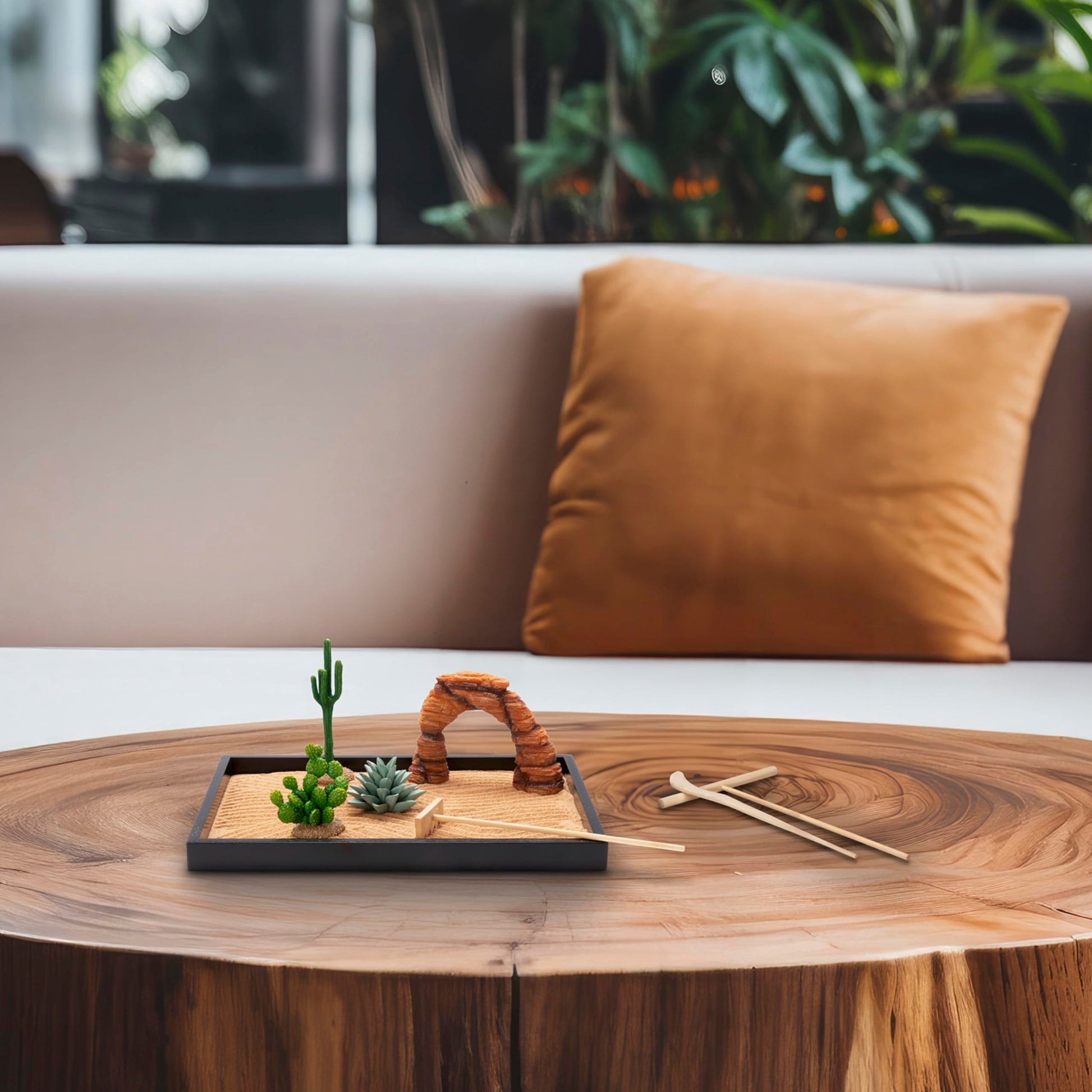 Este jardín zen de escritorio con temática del desierto ofrece un refugio de calma en cualquier espacio. Incluye arena marrón tostado, esculturas realistas de cactus y suculentas, un arco de roca y herramientas de madera para crear patrones relajantes. Con su diseño bohemio y detalles cuidados, es ideal como regalo o como pieza decorativa que invita a la concentración y la serenidad.