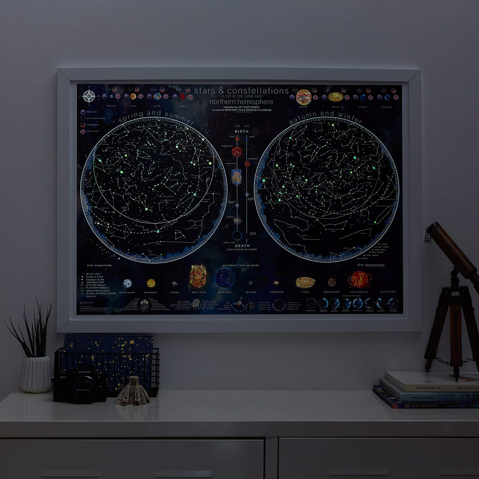 Este gran póster del cielo del hemisferio norte muestra constelaciones, planetas, satélites, eclipses y otros fenómenos celestes en un diseño repleto de información ilustrada. Lo mejor: brilla en la oscuridad, convirtiendo tu habitación en una pequeña cúpula astronómica cuando apagas la luz. Fabricado en papel de seda de calidad y enviado en tubo, llega impecable y listo para colgar.