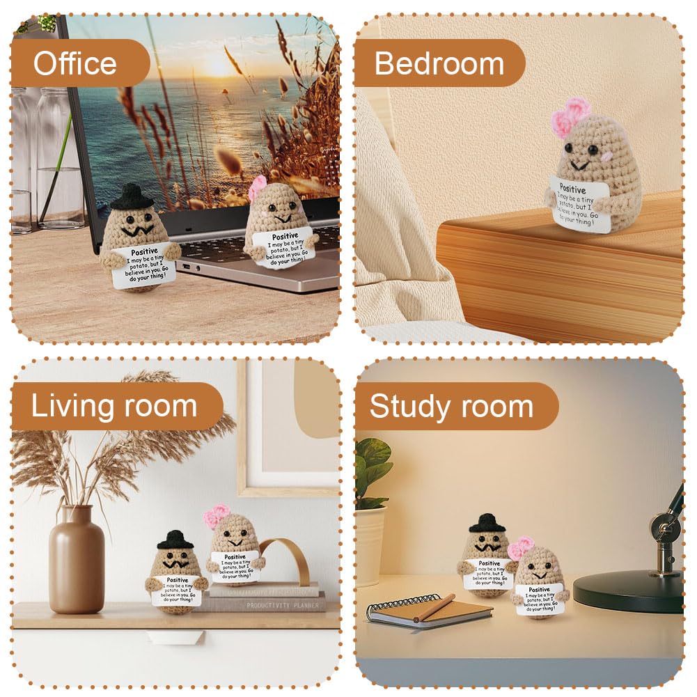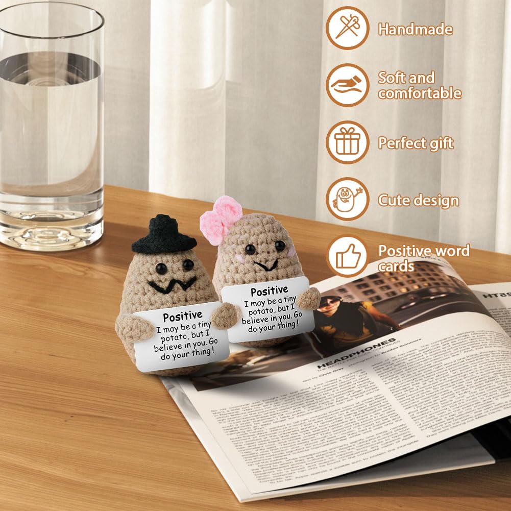 Esta encantadora pareja de patatas tejidas a mano trae el doble de suavidad y ánimo en tamaño mini. Cada muñeco está hecho de lana de alta calidad, con forma redondeada, textura elástica y acompañados de mensajes inspiradores que sacan sonrisas en días grises. Fáciles de llevar en el bolso o mochila, son el recordatorio perfecto de que todo mejora… y mejor si es en pareja.