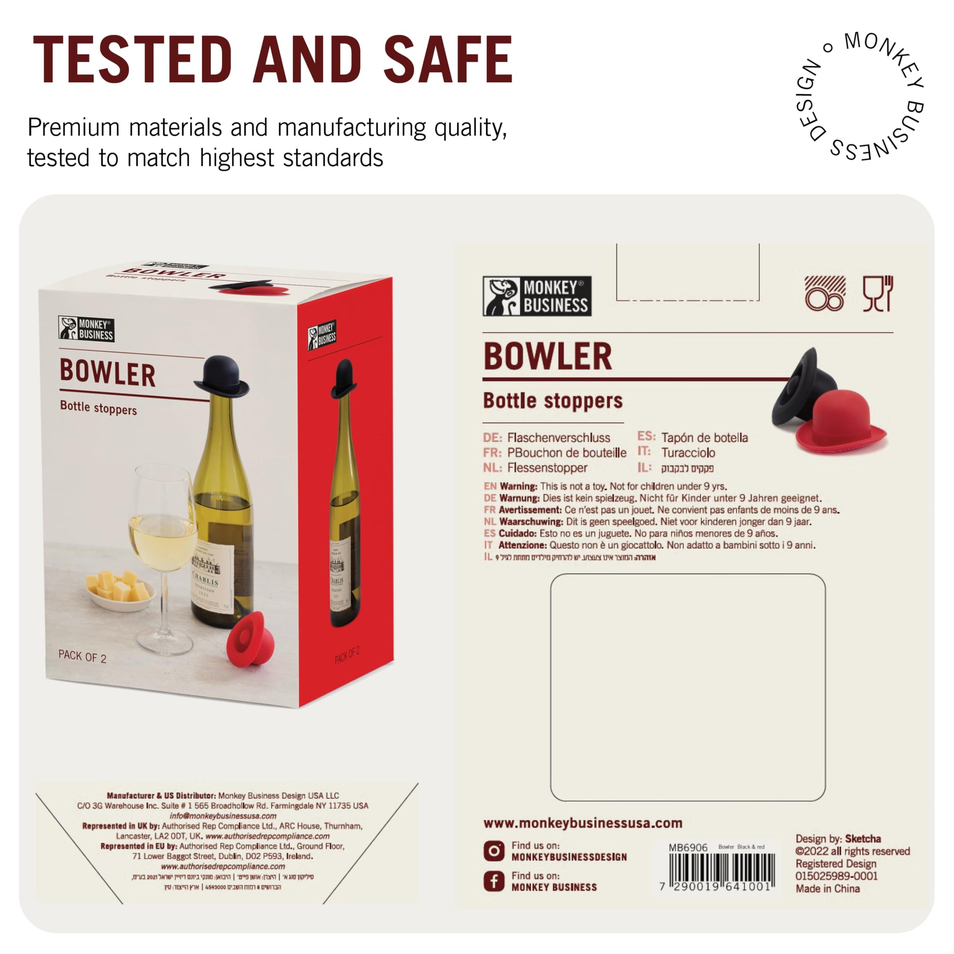El corcho que se niega a ser aburrido. Mr. Winecap de Monkey Business mantiene tu vino, champán o refresco en su punto, sellando la botella con su elegante y divertido sombrero bombín. Un guiño de estilo para tu nevera y un guardián eficaz de aromas y burbujas.