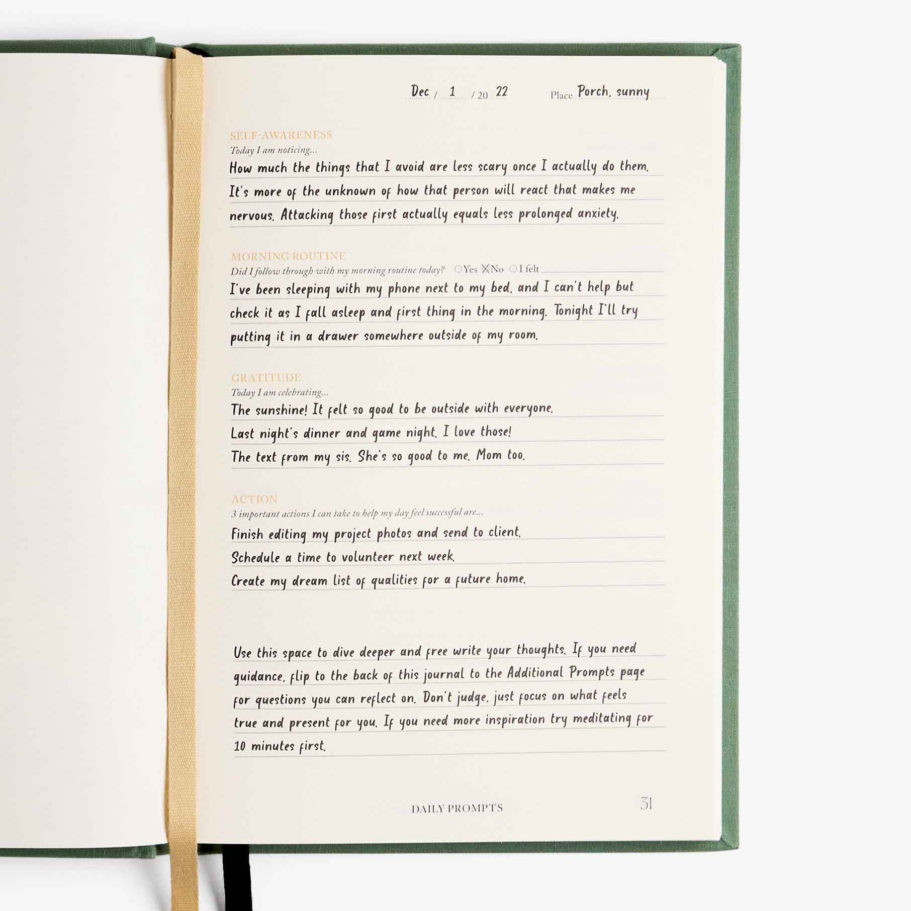 • Práctica guiada de atención plena: preguntas diarias que te ayudan a respirar, soltar y centrarte en lo esencial.