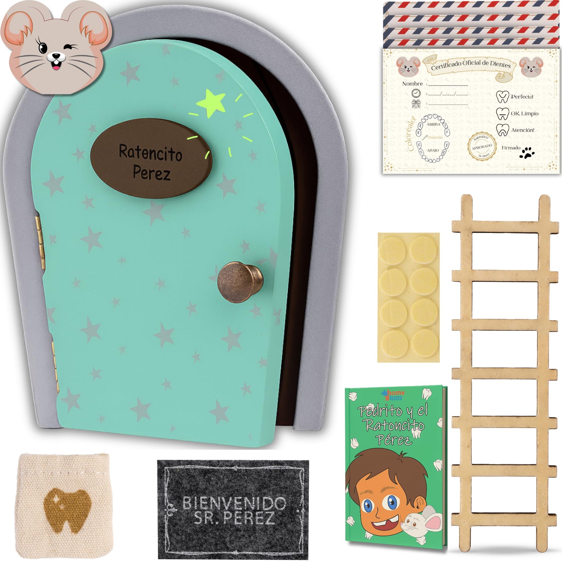 • Set completo: puerta, escalera de madera, mini plato con queso, bolsita para dientes, estrellitas adhesivas y certificados únicos.