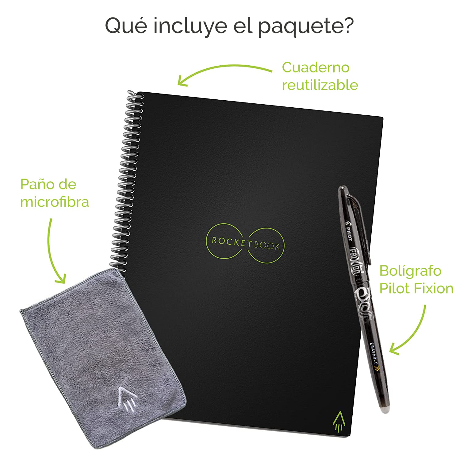 - Todo lo que necesitas: incluye un cuaderno borrable Rocketbook Core patentado (15 cm x 22,4 cm) con 36 páginas de cuadrícula de puntos, un bolígrafo Pilot, un paño de limpieza de microfibra y la aplicación Rocketbook con acceso a la nube