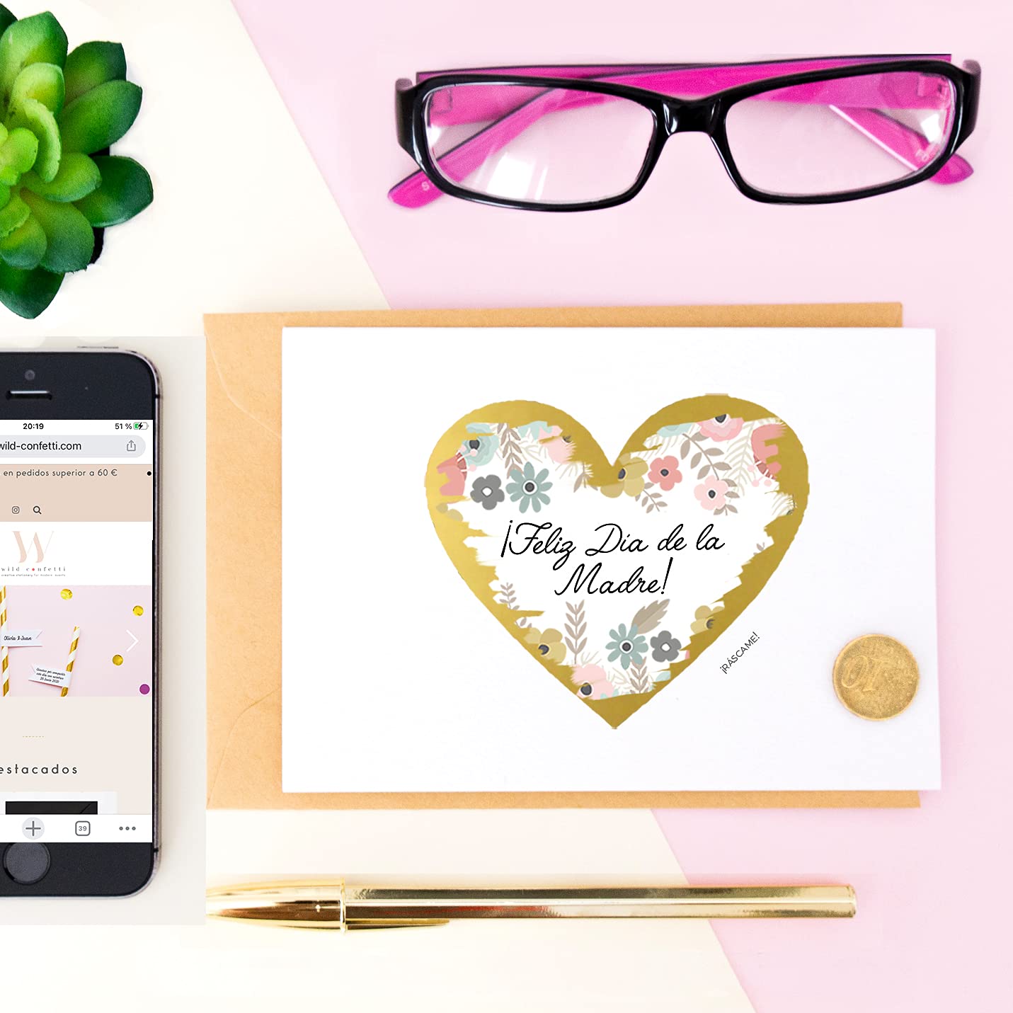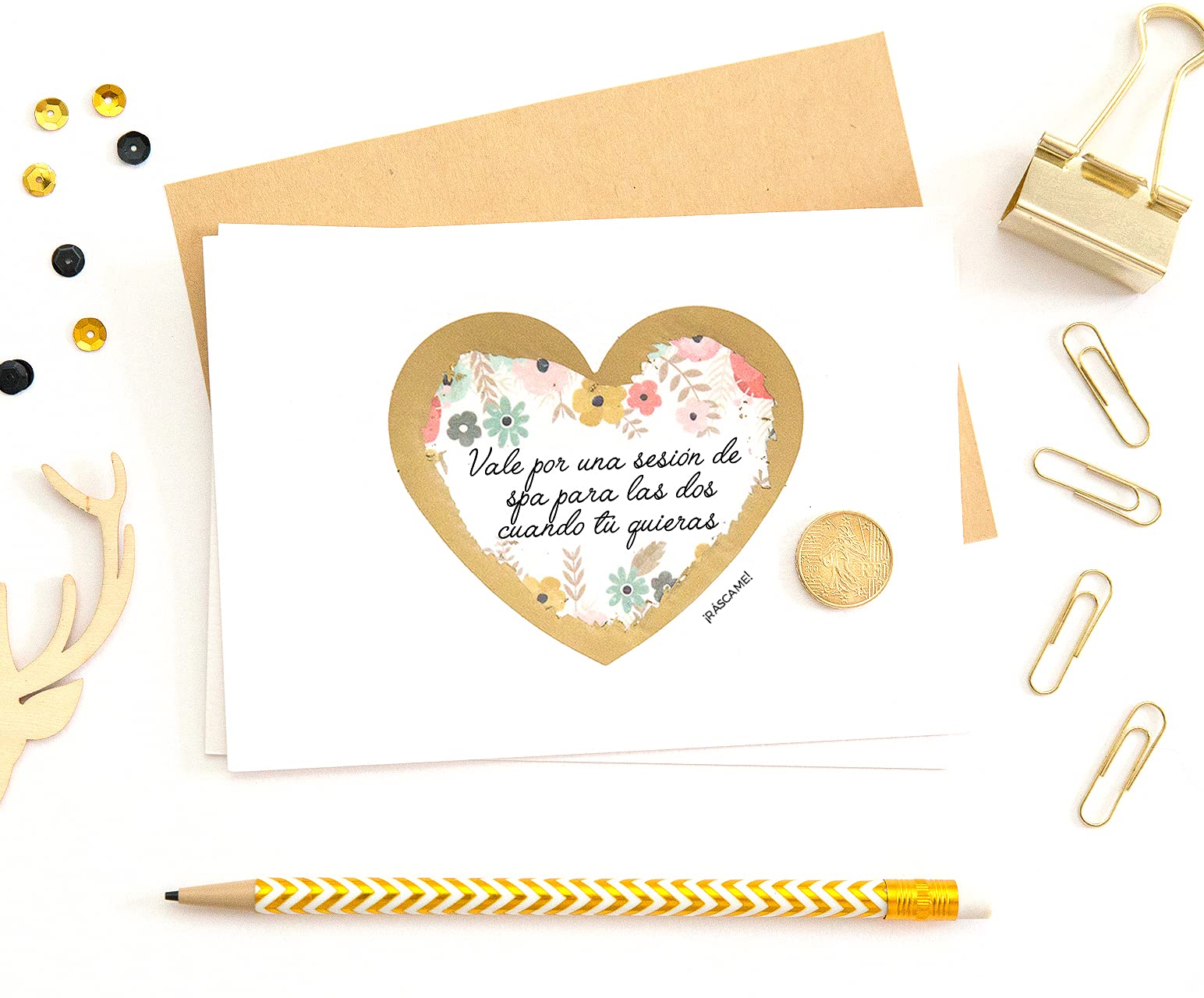 Esta tarjeta rasca es un guiño dulce y divertido para sorprender a tu madre como se merece. Puedes elegir entre frases ya impresas o escribir tu propio mensaje en la opción en blanco. Luego solo tienes que cubrirlo con la pegatina dorada incluida y dejar que ella lo descubra con una moneda. Impresa en papel de alta calidad con textura canvas, es un vale regalo con corazón… y mucho ingenio.