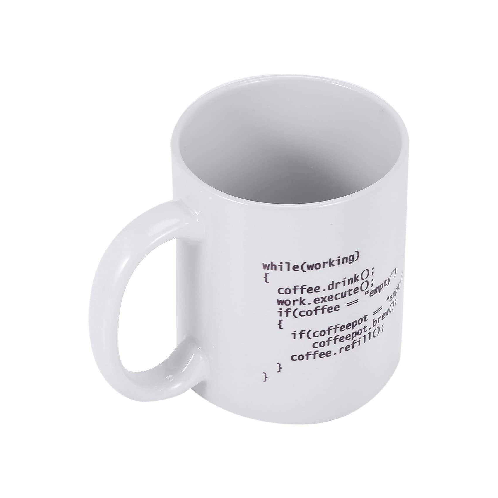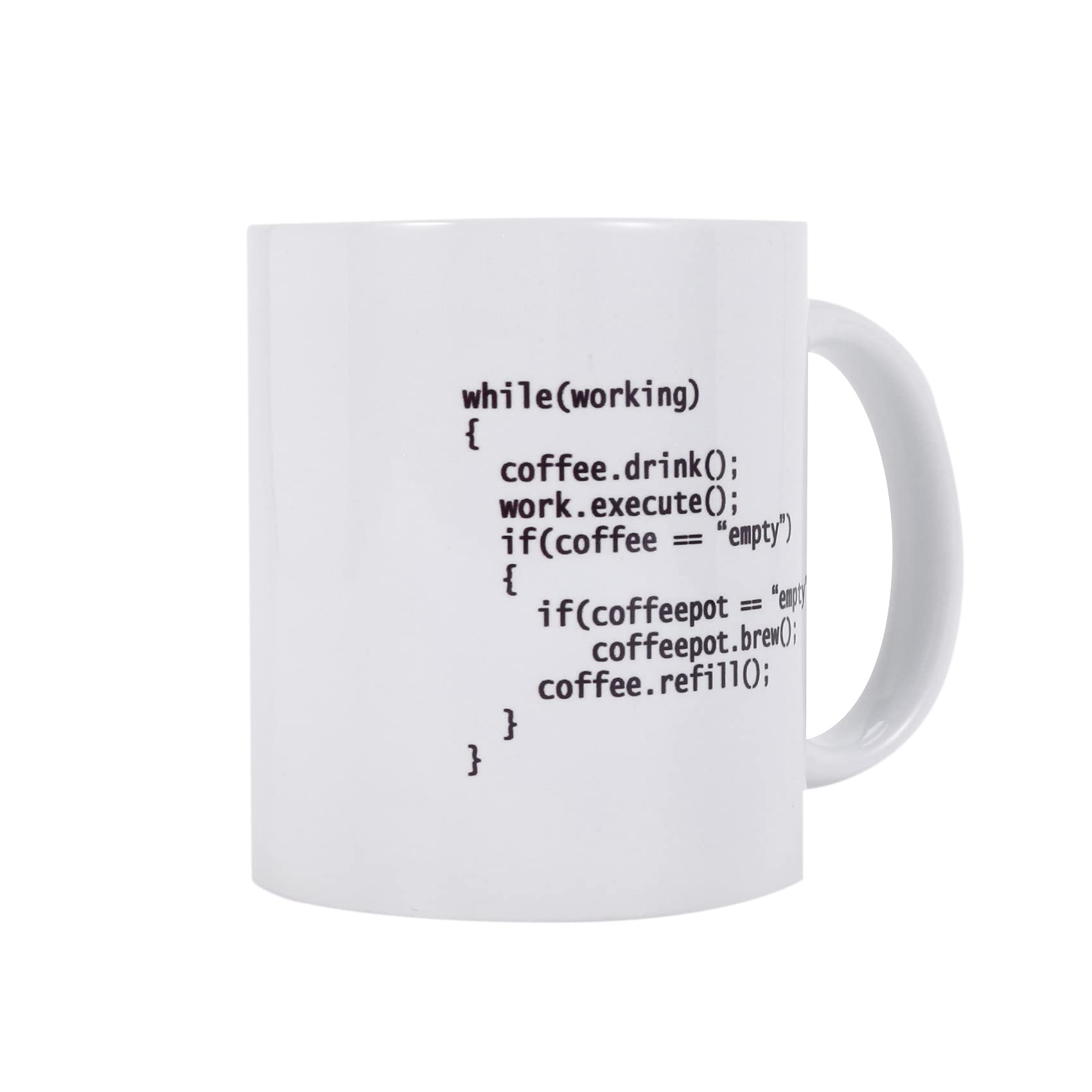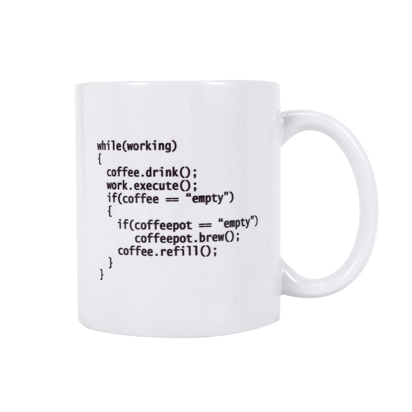 El algoritmo mañanero más efectivo cabe en una taza. La while(working) es una taza blanca de cerámica con código impreso en negro que resume la rutina de cualquier programador: beber café, trabajar, repetir. Minimalista, práctica y con humor geek, es la compañera perfecta para largas sesiones de código y café.